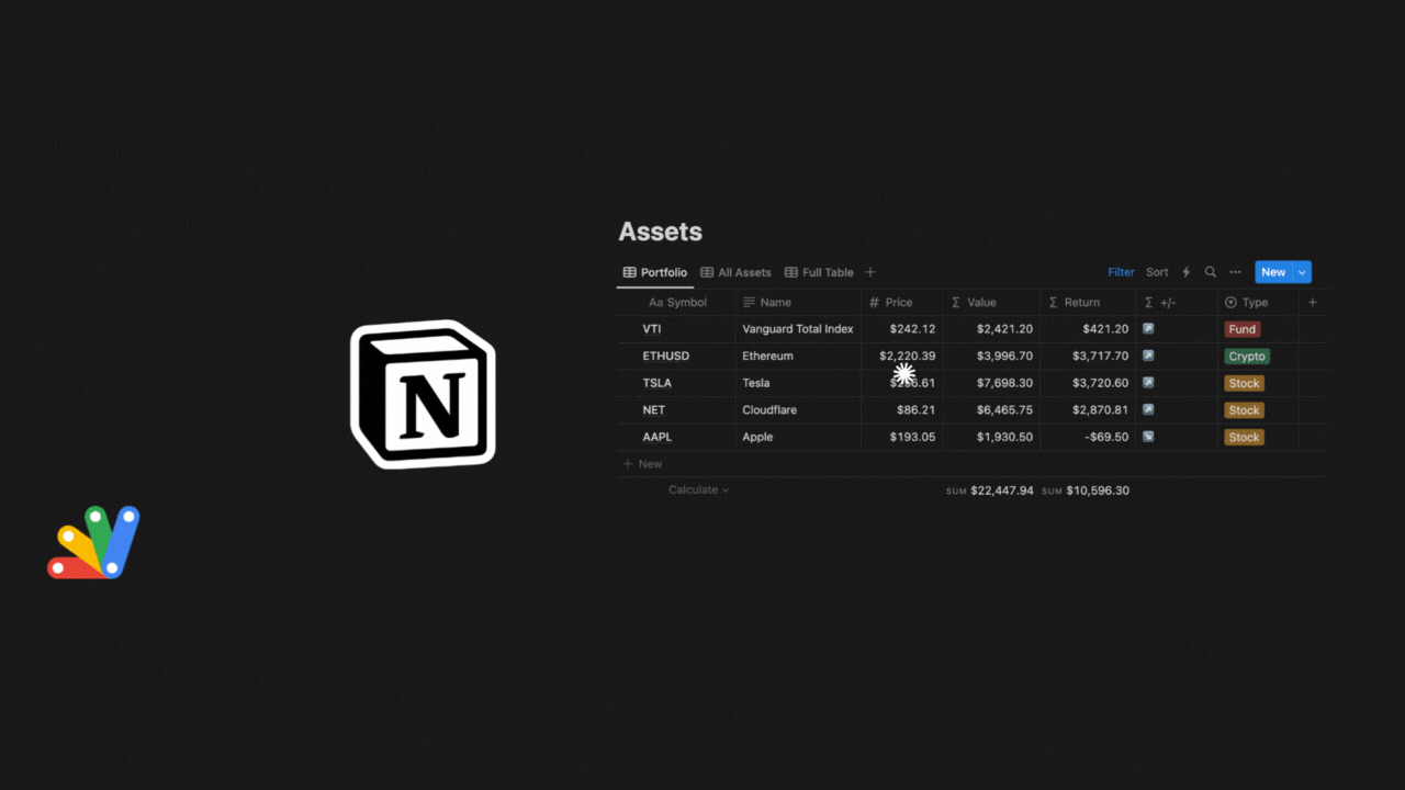 Hello, I'm Taylor. I wanted to use Notion as a database for my stock transactions, but quickly realized that being able to update live prices of those stocks in Notion was a huge pain in the butt. After trying out a few templates and procedures, I tried to do better: